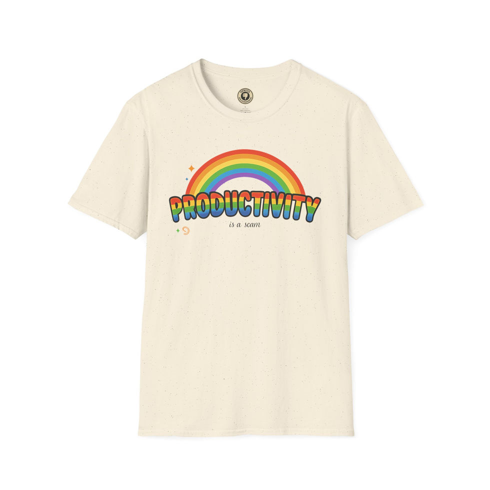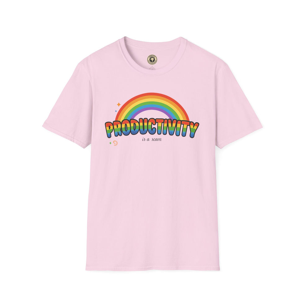 For everyone who’s tired of hustle culture, motivational posters, and strangers on the internet telling you to “optimize your mornings,” this tee is your cheerful middle finger to the grind. The design pairs a bright, sugary rainbow with a message that lands like a glitter-covered brick: PRODUCTIVITY is a scam. It’s the perfect blend of “cute” and “I’m not doing that,” ideal for anyone who believes rest is a right, not a reward.