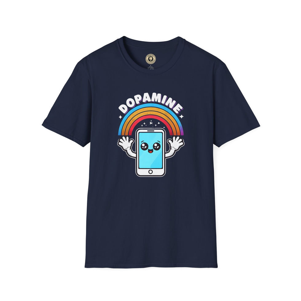 This tee puts the moment front and center: that cheerful little phone, arms raised beneath a rainbow labeled DOPAMINE, celebrating every scroll, tap, and accidental refresh like it’s a personal victory. It’s cute on purpose. Disarming. Almost wholesome. Which makes it much easier to ignore the part where it’s quietly describing your entire personality.