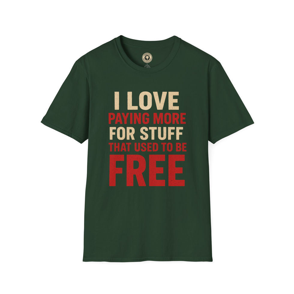 Introducing the “I Love Paying More For Stuff That Used To Be Free” Tee — a bold, sarcastic takedown of inflation, subscriptions, and the endless parade of “convenience fees.” With distressed typography that screams frustration, this design drags modern price-gouging into the spotlight where it belongs.